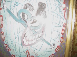 That arrow/airplane’s flight exhaust of loop de loops creates eyes above the mouth, the tubing, our brain disconnected or primed for a connection. Having eaten way too many cupcakes this Valentine’s Day, I’m in no shape to say.
