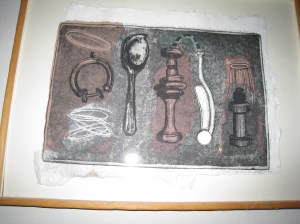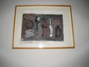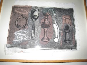 In this print hanging near our dining table, Debra Hensley-Luczycki answers that question with a smirk, the exhaust of Cupid’s arrow’s flight, and unconnected black tubing. Keep in mind, this print from the early 1990’s completed when Hensley-Luczycki was a graduate student at Tulsa University, is featuring a smirk way before it was a trendy term.